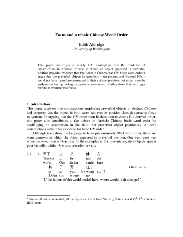 (PDF) Focus and Archaic Chinese Word Order Edith Aldridge Academia.edu