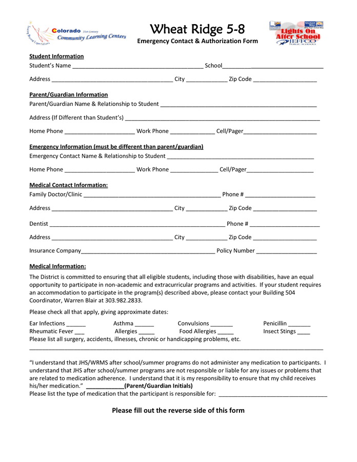 Emergency Contact & Authorization Form in Word and Pdf formats