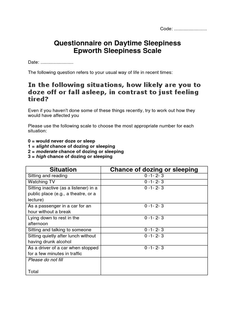 Epworth sleepiness scale how likely are you to doze off or fall asleep in the following situation, in contrast to feeling just tired? Epworth sleepiness scale this scale is used to determine a person’s level of daytime sleepiness. In the following situations, what is your. Be as truthful as possible. Epworth sleepiness scale (ess) how likely are you to doze.