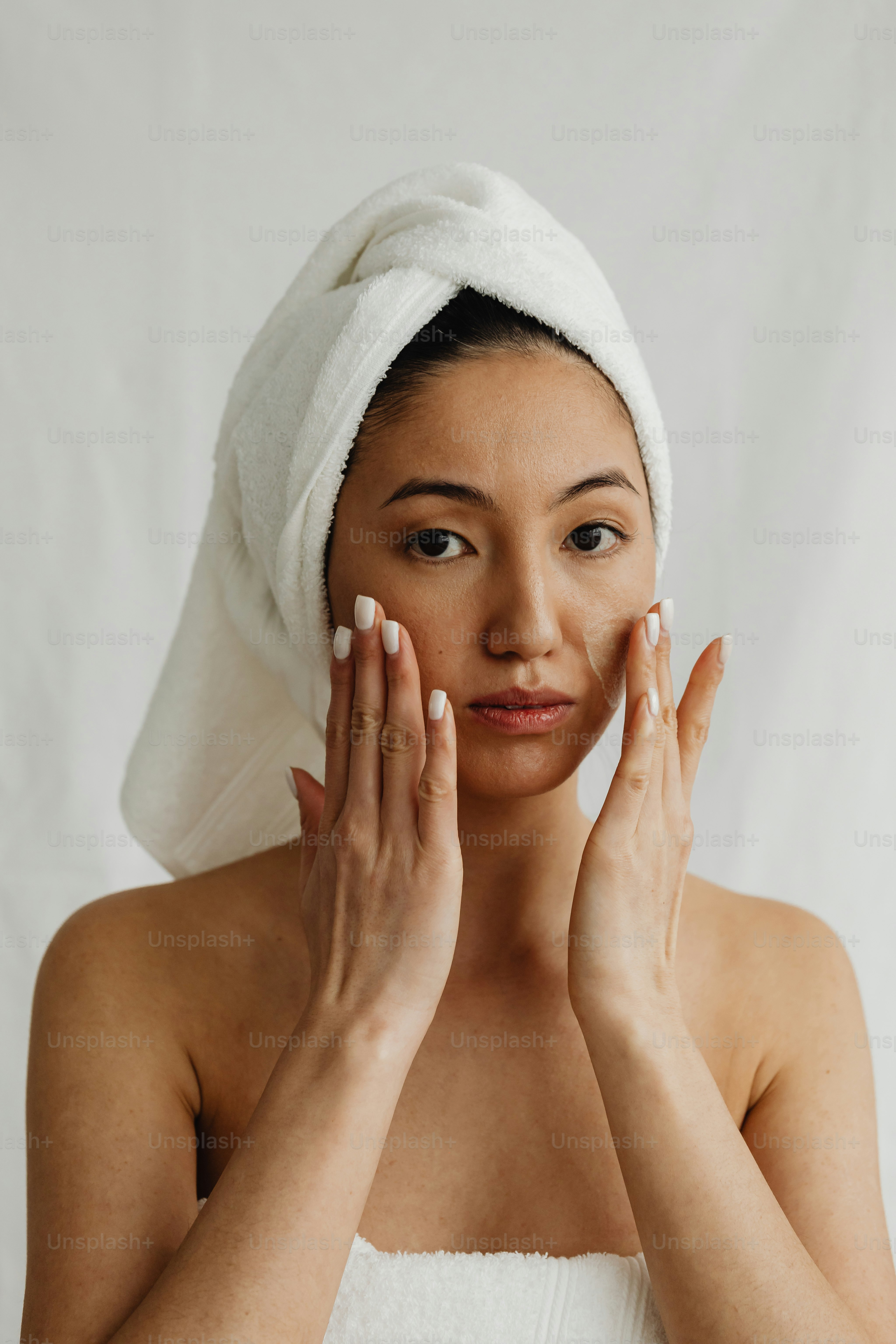 Una mujer con una toalla en la cabeza llevándose las manos a la cara