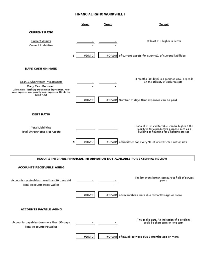 This worksheet and accompanying guide translates the financial data from the irs 990. Financial ratio worksheet provided by nonprofits assistance fund 2008 year: This tool provides calculation of 14 ratios, including a mix of balance sheet and income. While there are dozens of ratios that can be calculated, most nonprofits can use a handful. While there are dozens of ratios.