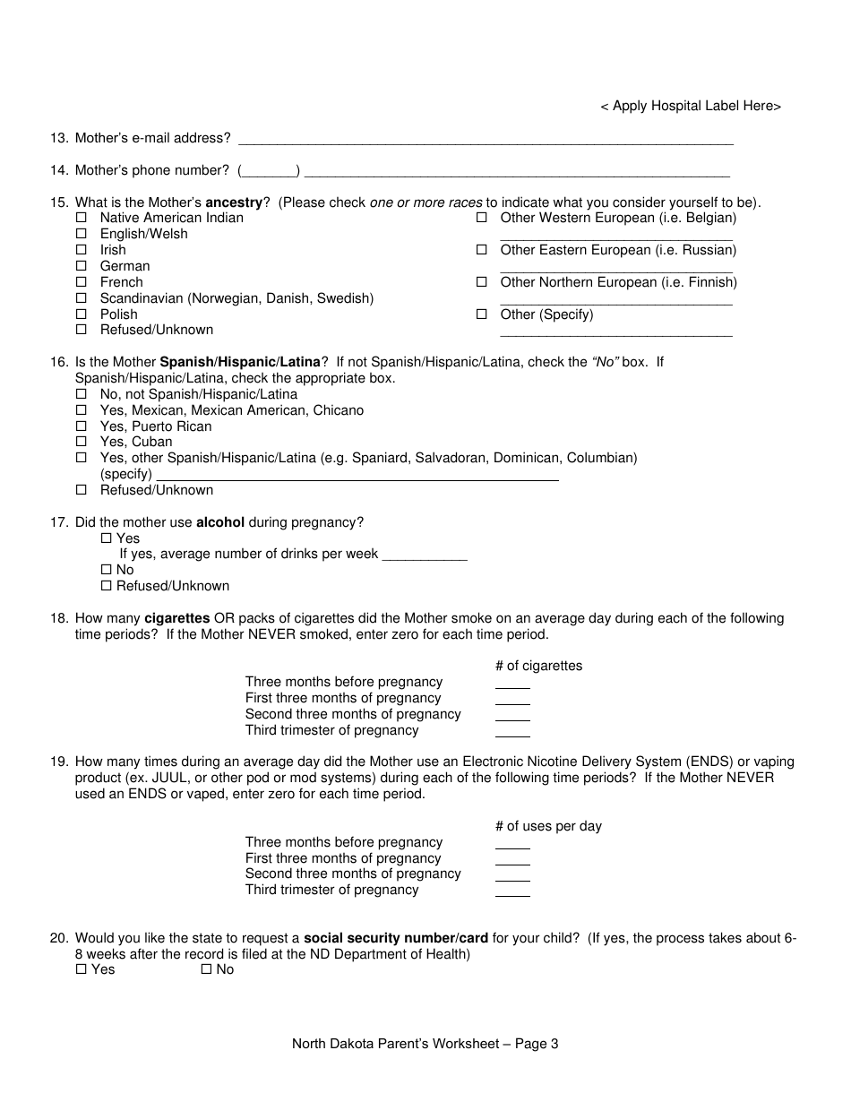 North Dakota Parent's Worksheet for Completing the North Dakota Birth