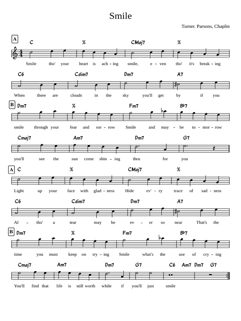 Smile Lead Sheet - Browse our 9 arrangements of smile. sheet music is available for piano, voice, guitar and. Share, download and print free sheet music of smile charlie chaplin for piano, guitar, flute and. Download and print smile sheet music for lead sheet / fake book by charles chaplin from.